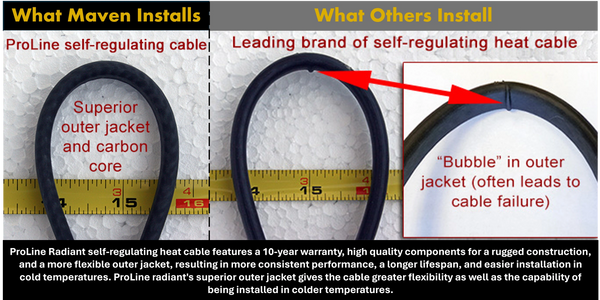ProLine's high quality outer jacket is more flexible than other leading cable - even at low temperatures - resulting in more reliable performance and easier installation when using roof clips and securing the cable to roof edges, gutters, and pipes. The heat cable's high quality carbon center is also more resilient in low temperatures, thereby allowing ProLine self-regulating cables to be safely installed at temperatures as low as 0°F.